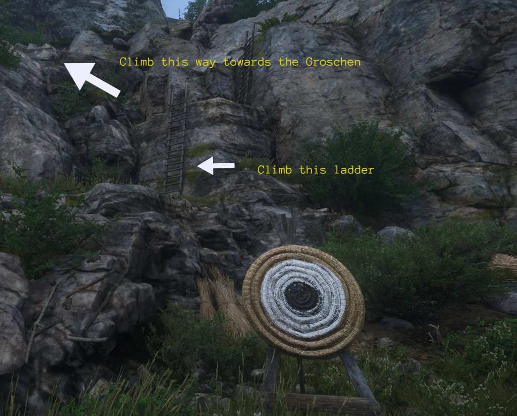 If you climb the ladder on the North side and make your way to the tree you will find a pile of stones, if you search them you will receive approximately 500 Groschen*.